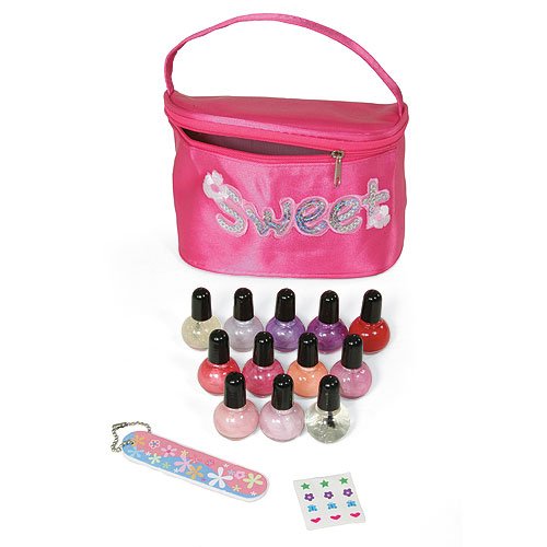 We tested numerous nail polishes before finding a formula that's truly gentle on growing nails! (Most nail polishes are just too harsh, even some that are labeled for kids.) This charming girls' manicure set includes 12 pretty nail polishes, 12 star and flower decals, and chunky nail file, all in a darling, fully-lined beauty bag. All the glamour of grown-up nail polish, but completely child-safe! Non-toxic. For ages 3 and up; recommend adult supervision. Imported. Styles may vary. A One Step Ahead Exclusive! . This girls' nail polish is formulated specifically for kids. Non-toxic nail polish set includes twelve.12 oz. bottles of polish in a variety of pinks, reds, purples, frosts, and shimmers. . Sequin appliquéd beauty bag features a zippered top and carry handle, and is fully lined to contain potential spills. . Beauty bag measures 6½"W x 3½"D x 4"H, with a 6¼"L handle. Each bottle of nail polish is 1¾"H x 1"W; nail file is 3½"L x ¾"W.